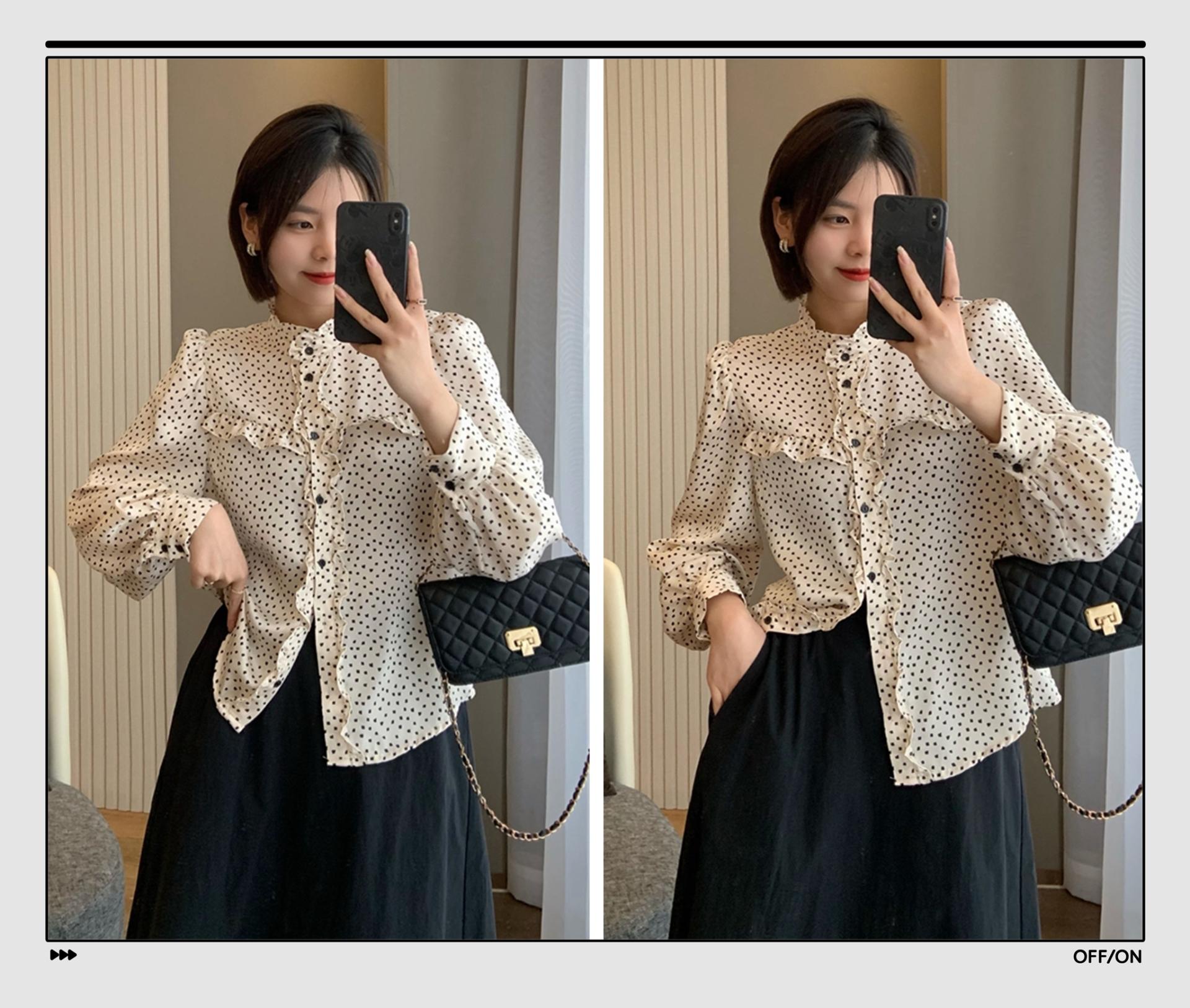“铁打的玛丽珍鞋,流水的衬衫”。这件很法式浪漫的波点衬衫,就是为春天而生的。领口、门襟胸前都做了木耳边拼接,视觉很显层次感。