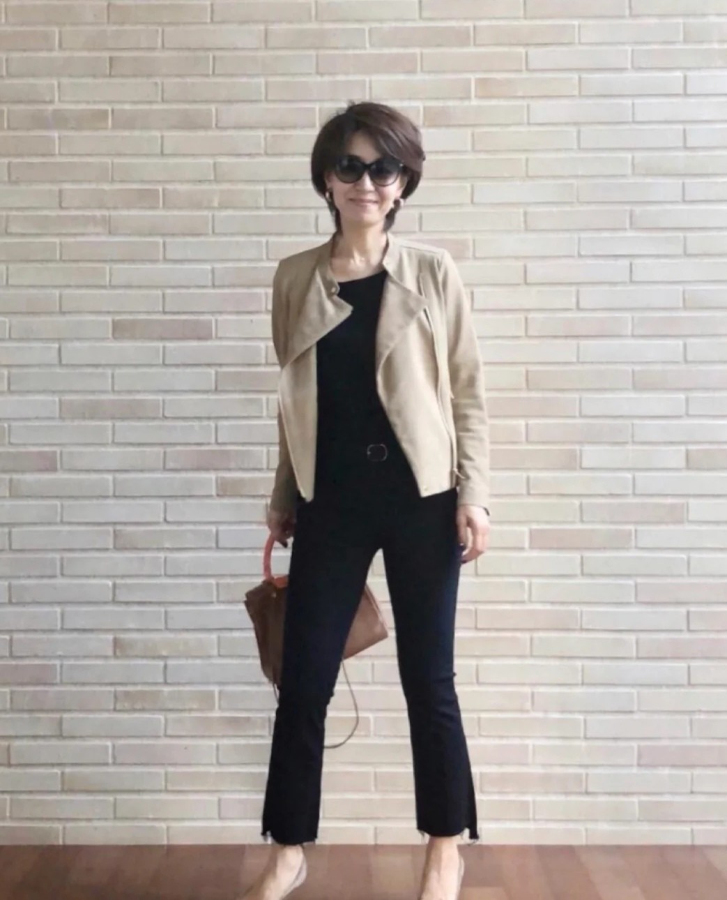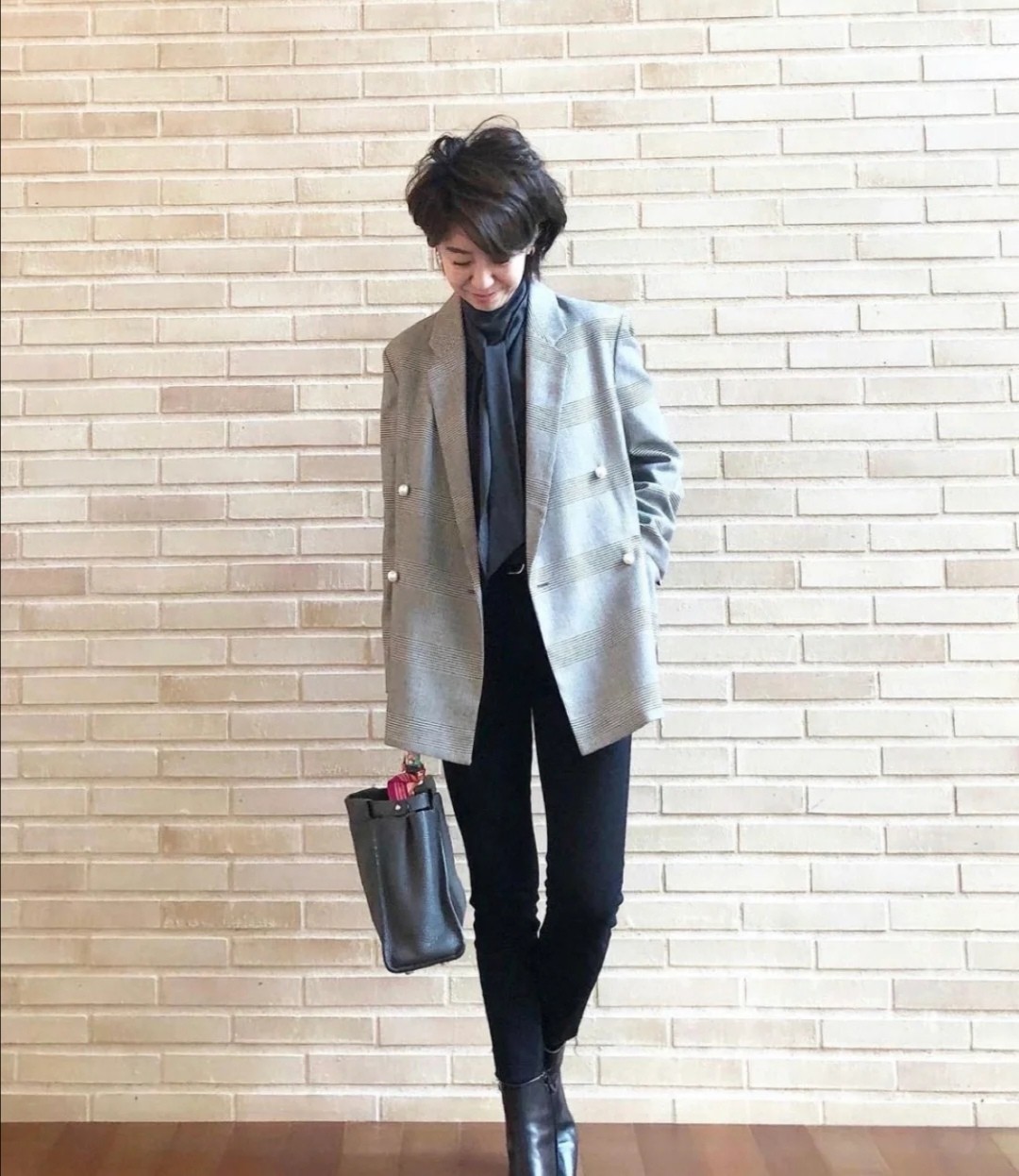 当内搭和裤装保持同色,都采用了黑色时,对身材进行巧妙地拉伸,矮个子的女士可以借鉴这样的配色手法,但前提是外套的选用颜色不一致,不然画面太暗沉,会显老气。