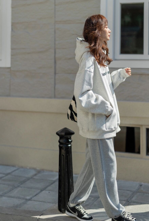 像博主用这种浅灰色的卫衣凹造型就会显得比较酷,而且浅灰色的卫衣是oversize的版型,这也能够营造出一种休闲感,看上去简约大气,和下半上的灰色运动裤有效的呼应,真的特别潮。