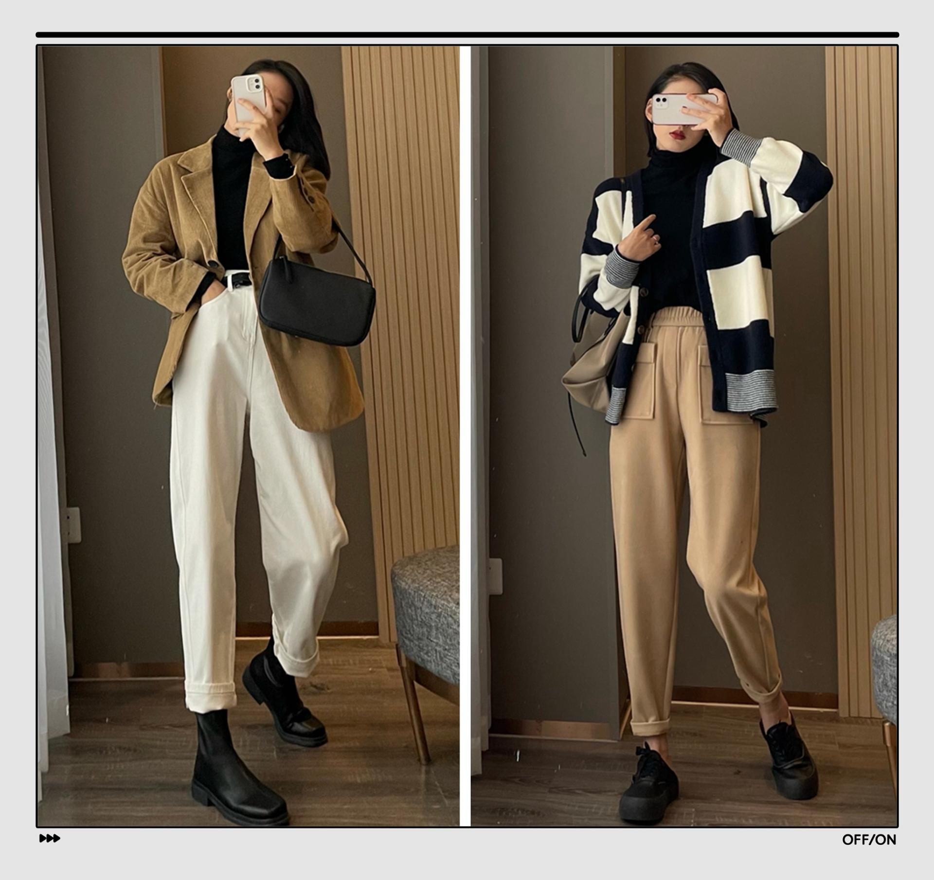 大地色的西装外套内搭黑色针织衫,给人很精神很有气质的感觉。把针织衫塞进高腰裤里,个性显腿长。