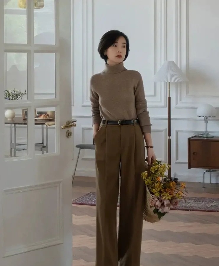 想要通过针织衫和阔腿长裤的配合,打造出对腿型拉长作用的女性,就要懂得调节好腰线,尽量把腰部位置重点烘托出来,才能导致身材比例优化得更加彻底。