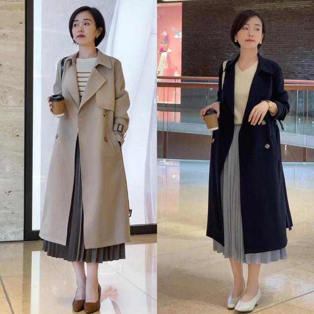 像是下图(左图)中的西装领卡其色风衣就是很不错的选择。结合软糯的毛衣与优雅的半身裙,轻松穿出知性气息满满的造型。