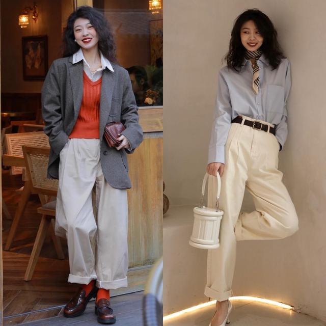 可若是你更喜欢气质知性又养眼的look,还可以入手莫兰迪色系的衬衣搭配白色西装阔腿裤,不仅能塑造出层次感,还能穿出低调又不失高级的效果。