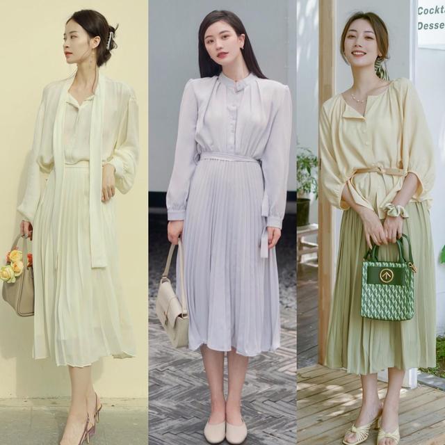 但要注意在选择这组搭配时,一定要将腰线的位置收紧,才能降低百褶裙的膨胀感,显瘦效果up!除此之外,在颜色的搭配上,我们还可多尝试同色系组合。利用同色系打造出和谐统一的效果,既省去了配色的烦恼,又能让你的搭配更加高级温婉。