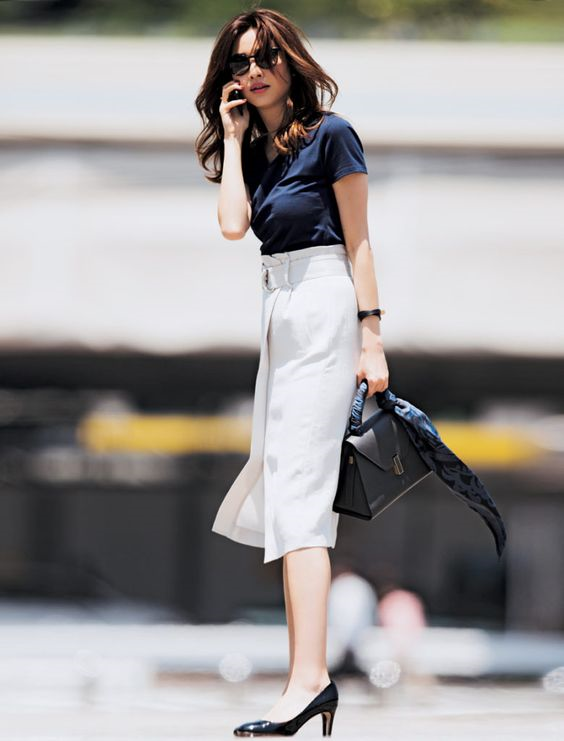 简单的配色,会让普通的高跟鞋,看起来更加精致有品位,可以选择深蓝色的上衣,搭配白色的半身裙,结合经典的黑色高跟鞋,让你的魅力变得更强烈。