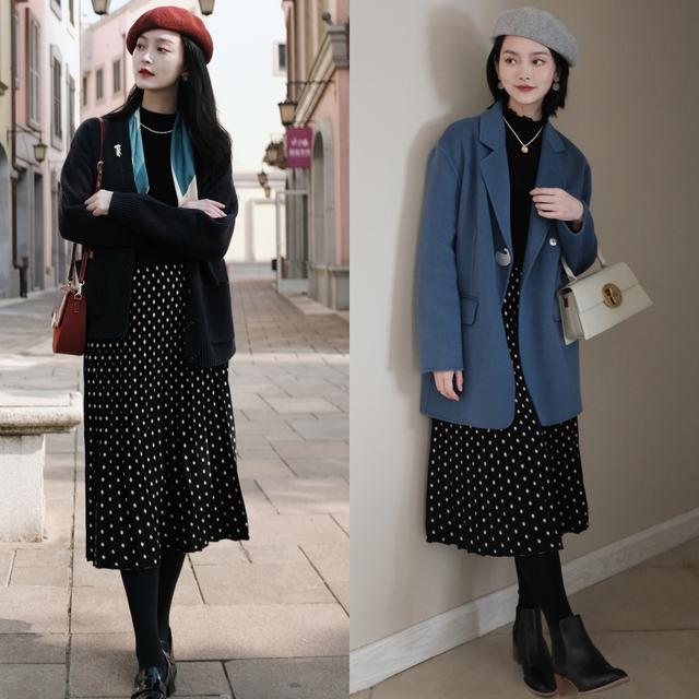 此时,我更推荐大家选择“同色系搭配”,pick一件黑色的针织开衫,内搭黑色针织衫+白色波点半身裙,白色波点的加入,为造型增加了几分层次感与气质感。