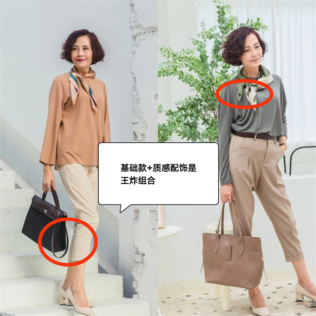 像上面这种颜色和版型都非常基础,甚至毫不出彩的服装搭配皮质手提包,丝巾等富有质感的配饰,那才是真正的优雅王炸穿搭!