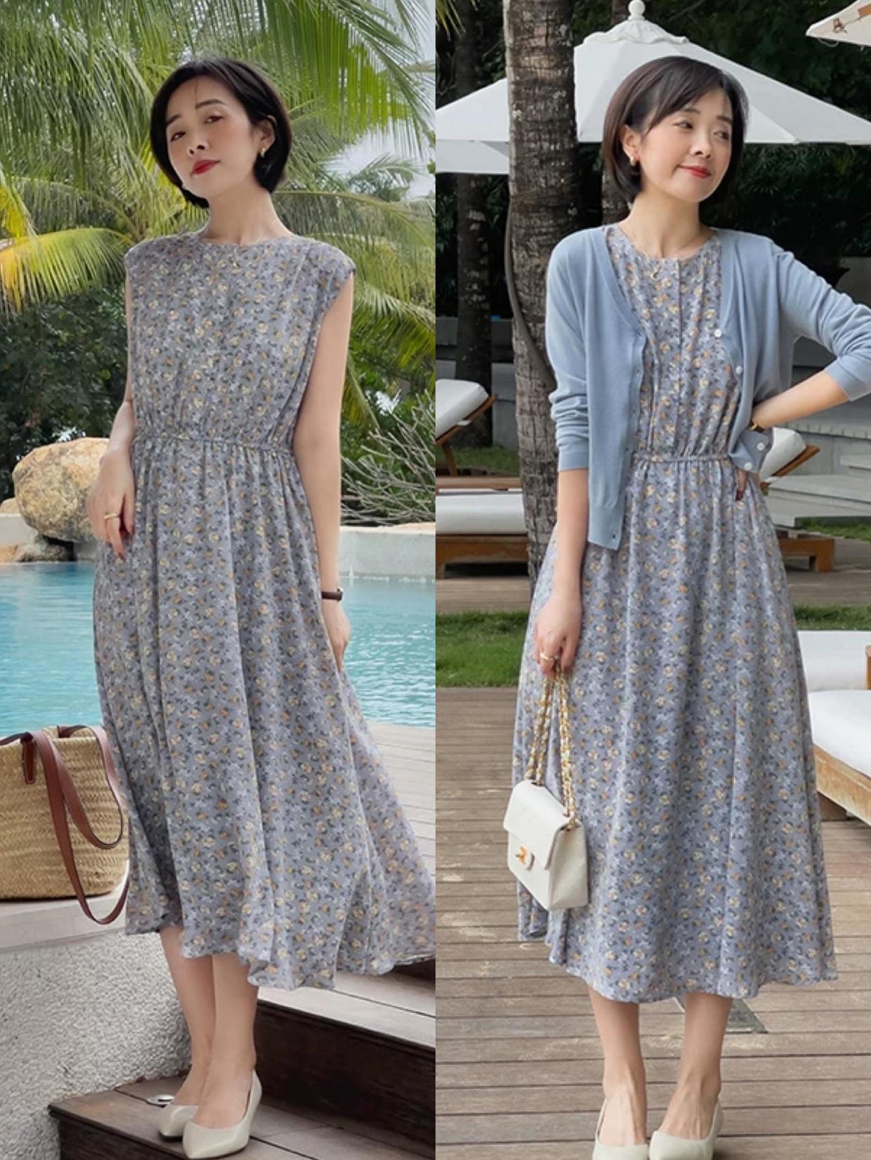 无袖设计的碎花连衣裙更适合闷热的天气,建议大家在早春时节搭配薄款针织开衫一起穿,这样能有效应付早晚的降温,不会让你感觉到凉意,也会注入几分岁月静好的气质。