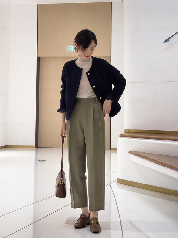 40岁的成熟女人在穿搭上面,不同于常接触时尚的黄毛丫头。她们在长时间的穿衣搭配中,早已经磨练出了一套独属于自己的穿衣逻辑和思维方式。黑色短外套配上修身的打底衫,内松外紧的搭配张弛有度又遮肉显瘦。下半身再配上自带干练氛围的墨绿色裤子。整套造型将优雅与干练诠释到位,尽显都市丽人的独立气息。