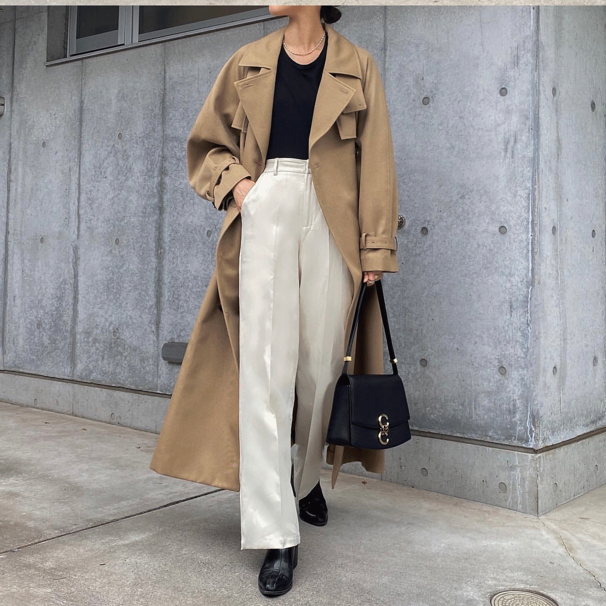 缎面材质的西装裤很好的削弱了驼色风衣外套,哑光面料带来的沉闷感。同时搭配上珍珠项链以及黑色手提包这些配饰,更显精致大气。