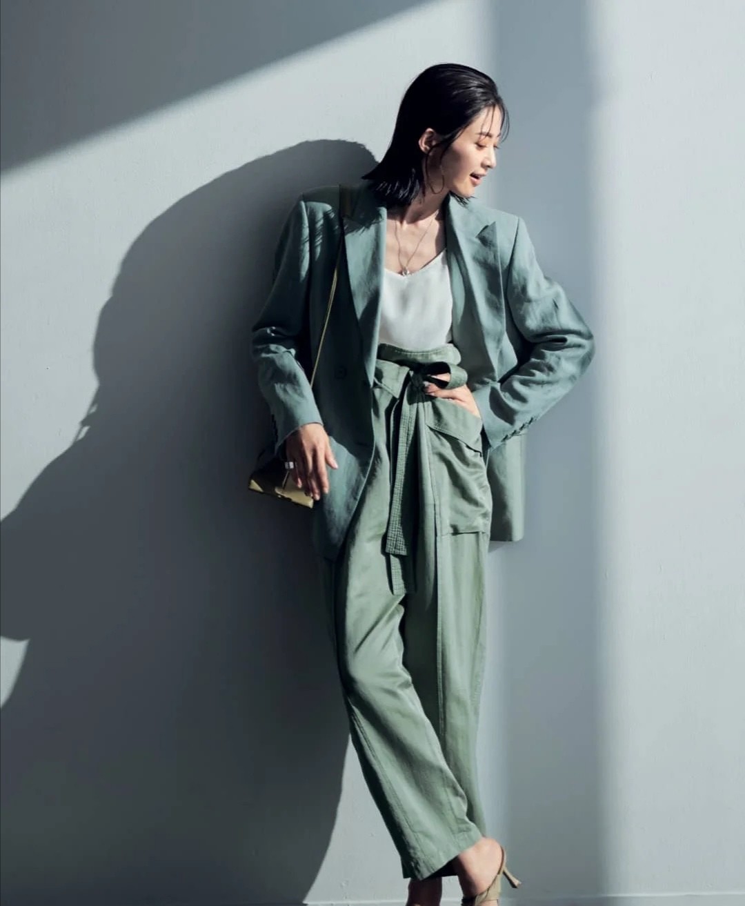 西装其实是一款很好驾驭的单品,采用绿色,可以提升活力范儿,也能带来清爽的格调和好看的视觉画面。薄荷绿色的单品就十分流行,干净大方又减龄。