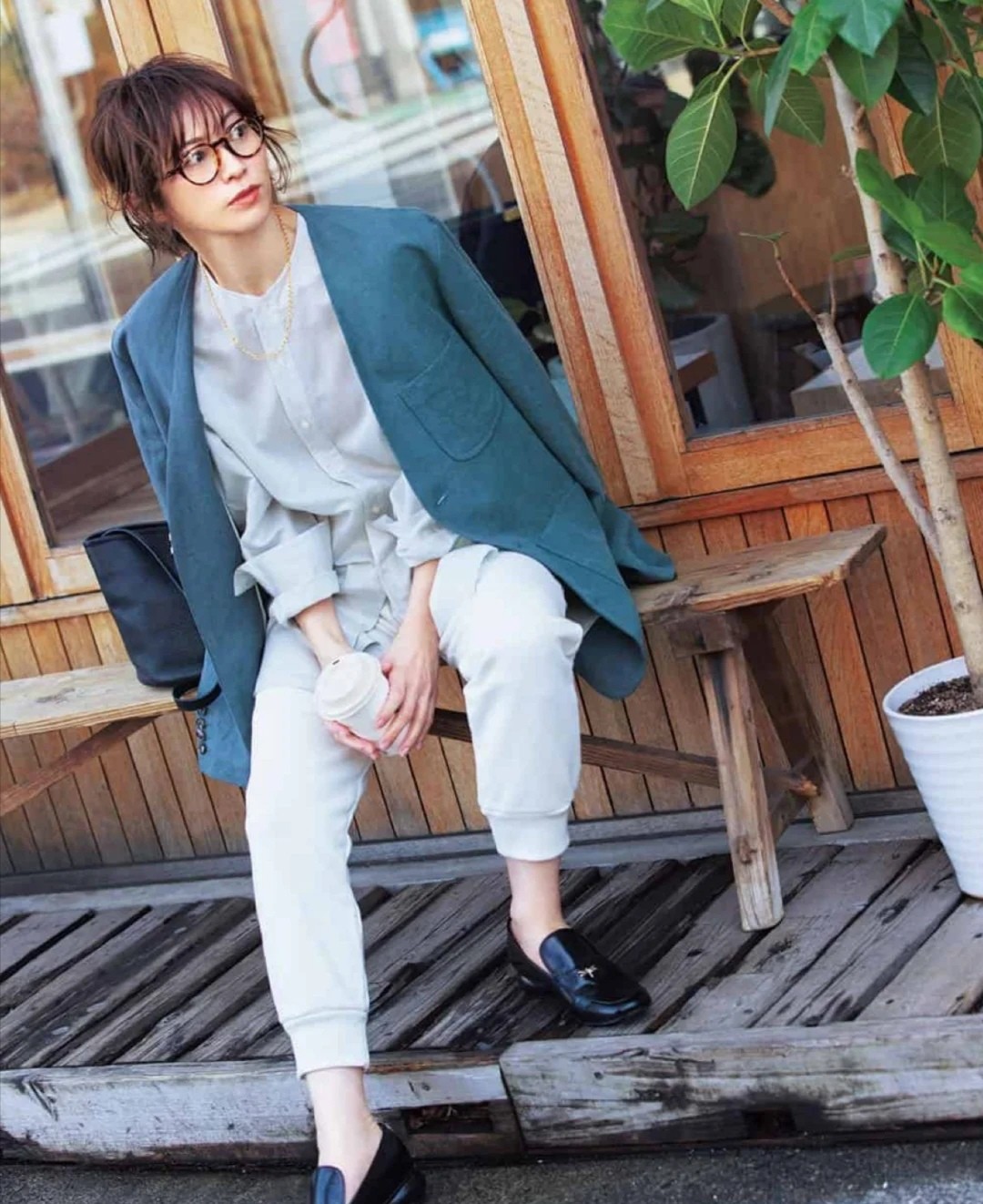 湖水蓝色的小西装,它有冷色调得清爽,属于质感很高的单品。要想利用它完成通勤穿搭,里面可以叠加一件白色T恤或是白色衬衫,而后者形成的干练感会更明显。加上白色束脚裤的配合,就会营造些许休闲感。最后脚踩一双黑色乐福鞋,和束脚裤的契合度很高。