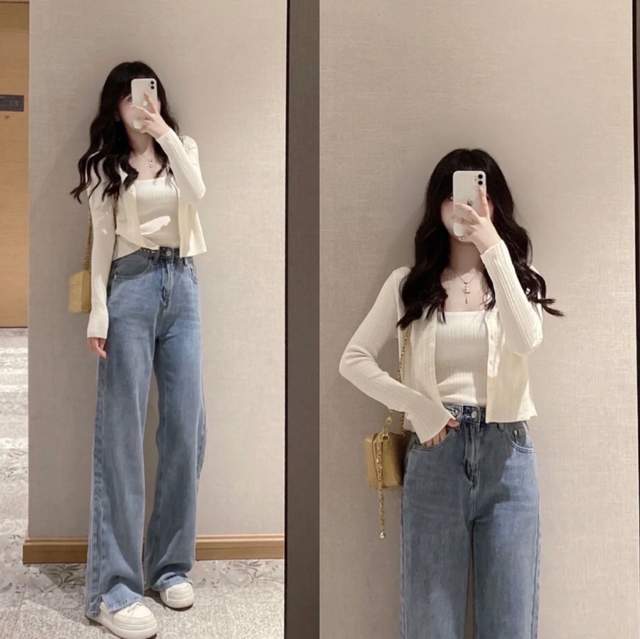 阔腿牛仔裤是浅蓝色带点开叉的拼接高腰设计,也是包容性较强的一个款式,对于梨型身材特别友好,收胯显瘦,好看又显高,不论上班通勤还是逛街休闲,简约大方的气质。白色针织开衫,简约干净的款式,自带温柔又优雅气质,内搭一件白色吊带,清爽干净的穿搭,简约舒适又显瘦的最佳搭配。