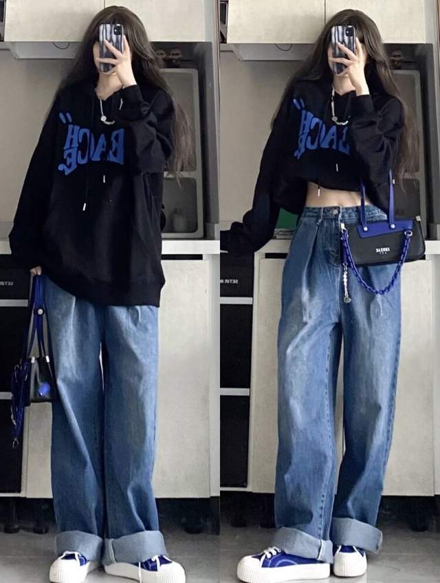 经典的拖地牛仔裤+黑色卫衣形成了甜酷风,裤脚圈上几圈,洒脱又气质,卫衣用了基础印花蓝色字母, 黑色与蓝色相结合,特显白皮肤,又甜又飒。