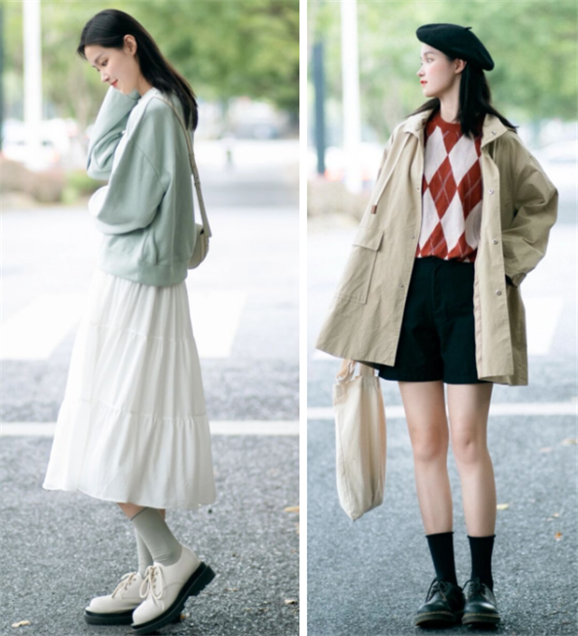 例如下面的博主用黑色半身裙搭配黑色短袜,绿色卫衣搭配上绿色短袜,颜色之间都是有小小呼应的,则能不费力地凸显出高级感。