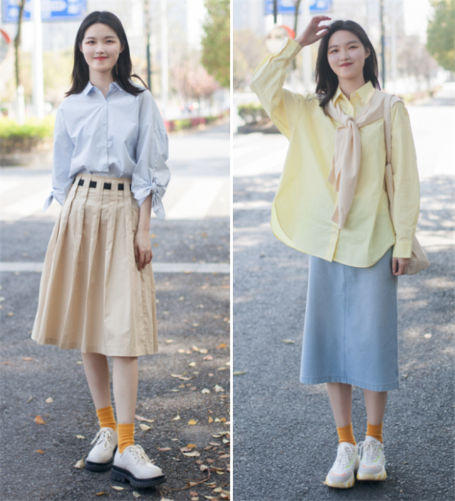 选袜子要注意它的颜色,不可以随意挑选哦,最好和你的搭配颜色上有所呼应,就像潮人们基本上都喜欢用同色系穿搭法则。裙子和袜子的颜色一致,这能够形成有效的呼应,让造型更和谐。