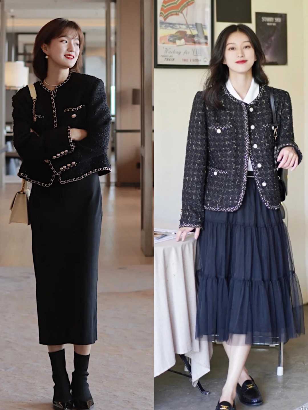 小香风外套和裙装可以说是非常合拍的一对搭档,优雅的裙装和复古时尚的小香风外套结合起来,能够让你瞬间化成为名媛。而且小香风外套本身就很淑女,结合各种优雅的小黑裙或者是薄纱裙装,都是能够凸显出女性魅力的。