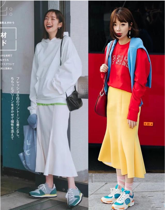 热衷于休闲风的姐妹不妨试试“鱼尾裙+休闲卫衣”的组合,同样是2种不同的风格,起到更微妙的化学反应。鱼尾裙的下摆有一些小的褶皱,和卫衣的休闲感很搭,穿上运动鞋俏皮可爱颇具少女感。