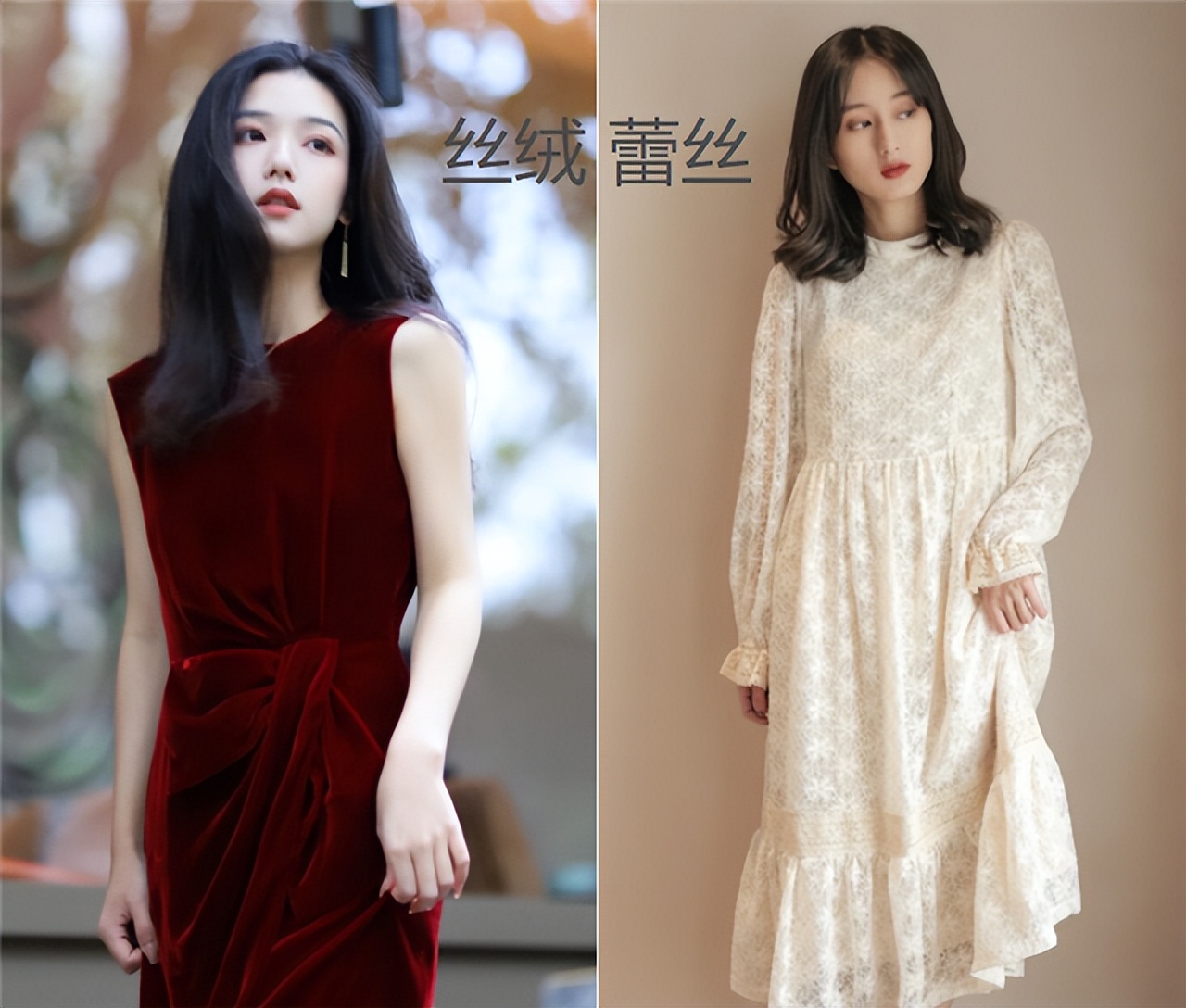 就算是同样的款式,但面料不同,自然就会展现不同风格,丝绒的材质比较贵气,很优雅精致,蕾丝的材质相对来说更清新甜美,所以风格也不同,但无论如何你们在选裙装时都要注意材质不能太廉价,否则就会显得很老气。