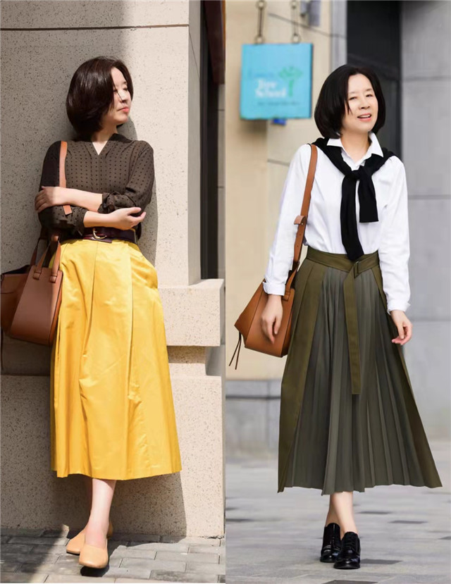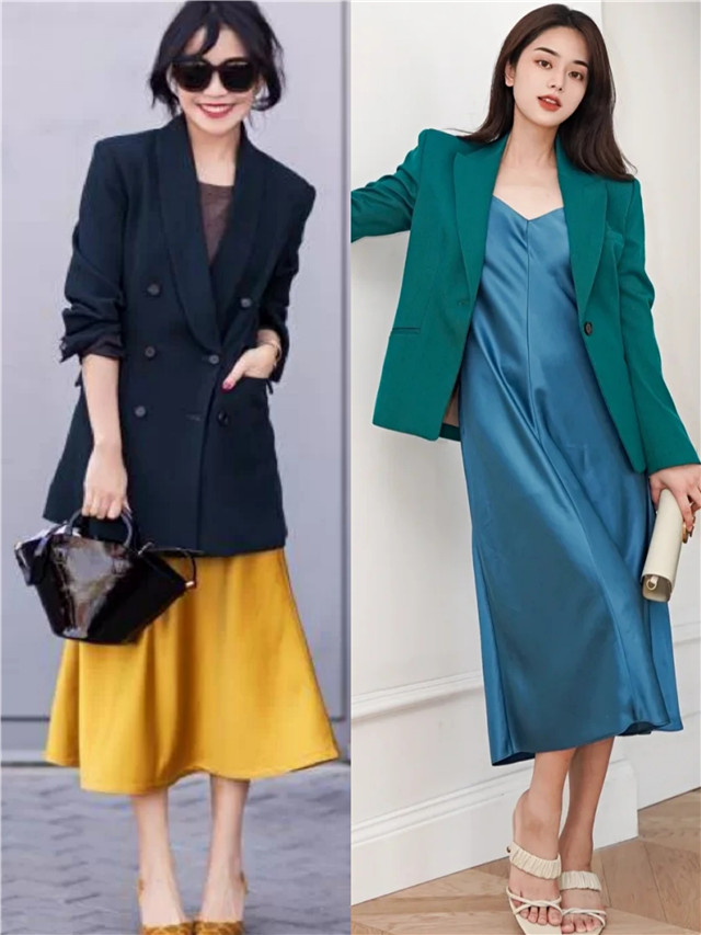 裙子看上去温柔知性,但它的搭配风格是多样化的,你可以参考不同的裙装款式。下面这些缎面裙装混搭不同颜色的外套就能形成明显的对比,层次感特别强,西装和裙装的颜色形成深浅结合的对比,也能够营造满满的高级感。