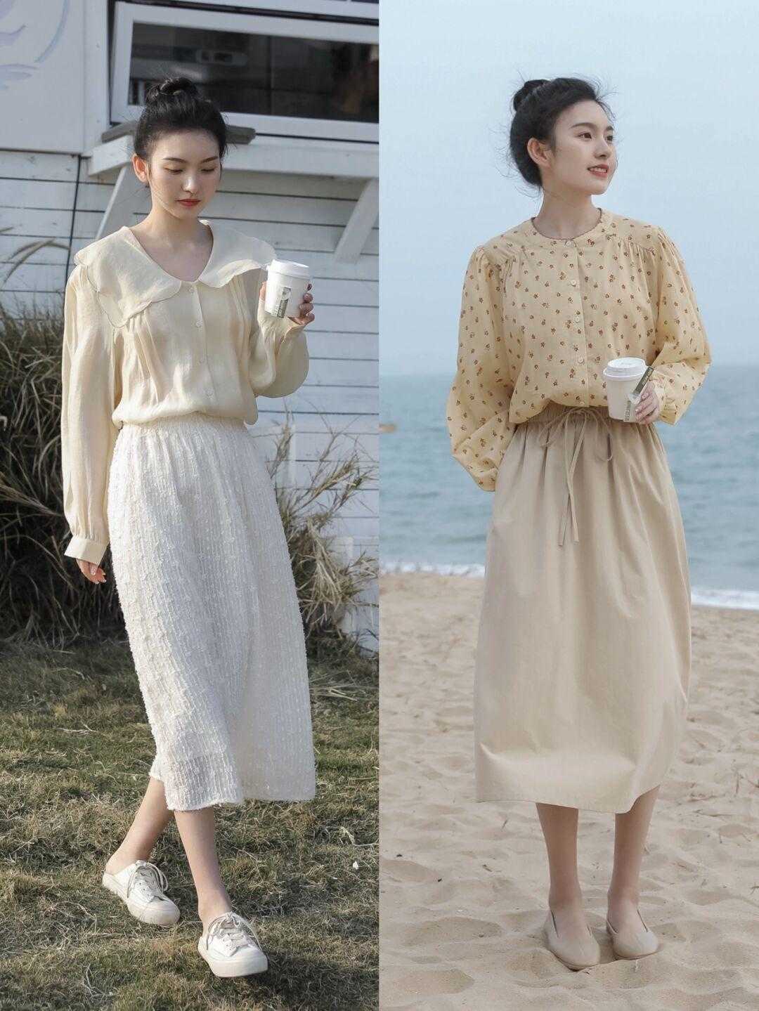 第二部分:露腿的穿搭解析1、高腰半身裙搭配平底鞋