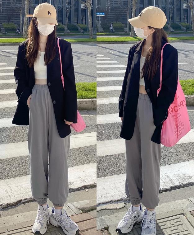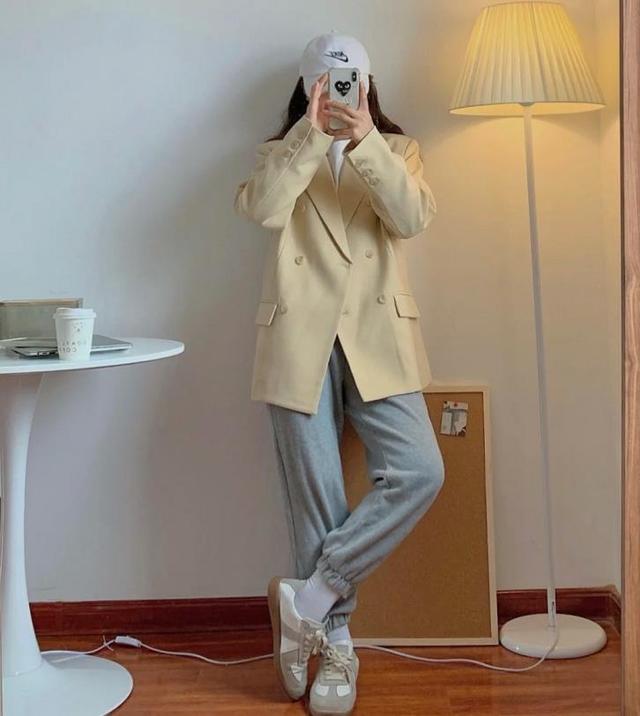 奶黄色系西装外套,不得不夸一下这个颜色,真的是既显低调又不失温柔,感觉就算是黄黑皮穿起来也会显得很白皙。选择灰色束脚运动裤来配,看似不搭,其实整体看起来还是蛮不错的嘛,别有一番味道的穿搭!
