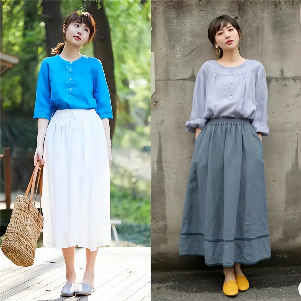右边的灰蓝色半身裙低调简约,匹配了黄色的单鞋会显得更具有亮点,撞色的搭配可以提亮整个造型。