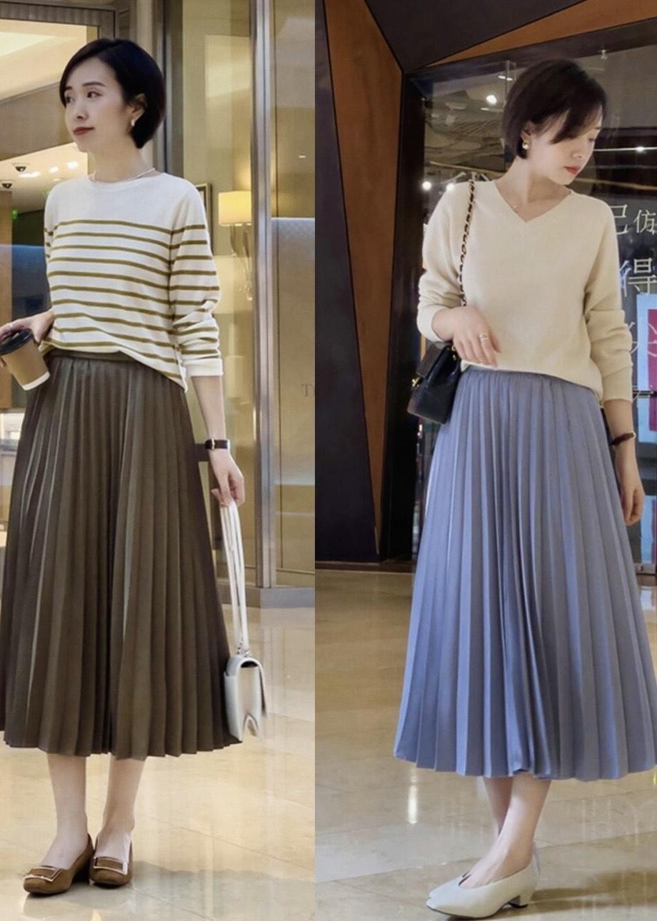百褶裙在半身裙里是比较经典的款式,相比普普通通的半身裙会更有造型感。大部分半身裙也会融入纯色设计,但是百褶设计能够让裙子更具亮点和设计感。如果大家想要让搭配看起来更加高级,可以试一试大地色系百褶裙。但如果想要展现少女感,那么浅色系半身裙会是一个更好的选择。
