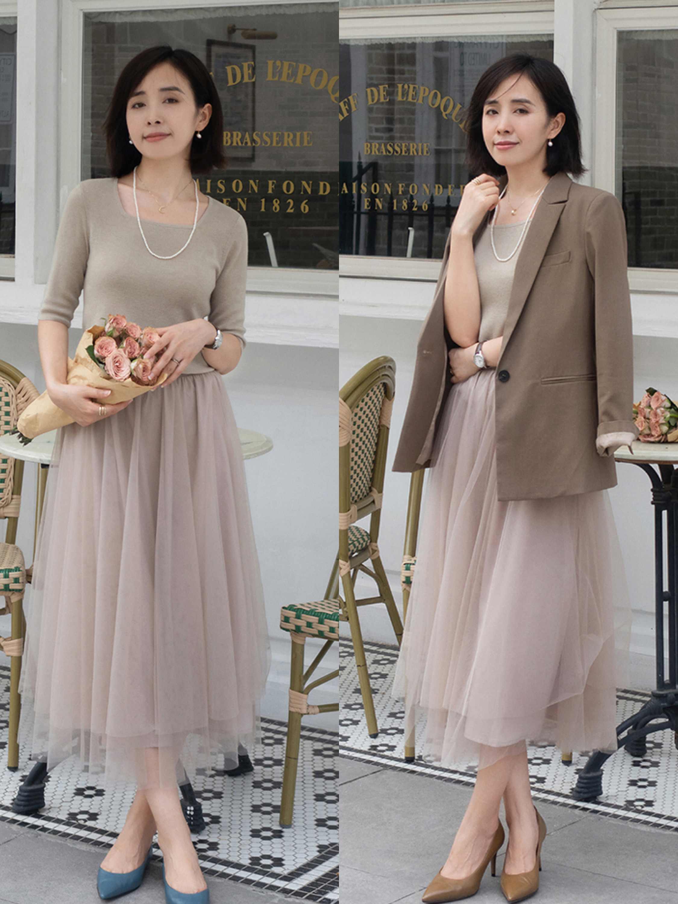 深色系薄纱半身裙更适合年龄稍微大一点的女生搭配,可以展现高级的美。但如果想要秀出小清新的魅力,不妨试一试浅色系半身裙。因为薄纱面料本身自带华丽感,所以建议针织衫选择简约一点的款式。担心纯色薄纱半身裙稍显单调的话,那么融合了条纹设计的针织衫可以让元素感更强。
