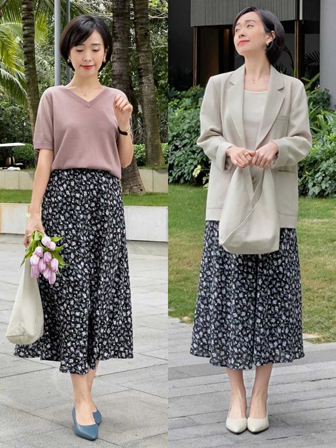 如果觉得连衣裙的搭配太单调,选半身裙也是不错的,半身裙有着更强的可塑性,搭配起来也很简单,像博主这些时尚的碎花半身裙搭配上针织衫或者是搭配上西装都能够演绎出时尚感,看上去也并不单调乏味。