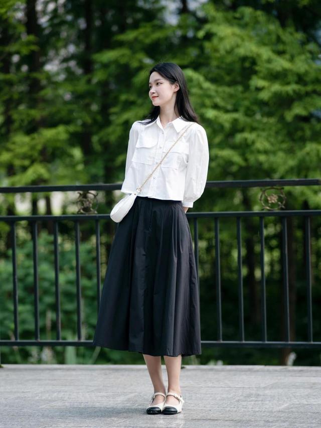 第三组我们分享的是最为经典耐看的,白衬衫搭配黑色的半身裙,一年四季里大部分女生都可以穿,非常接地气的组合。小心机之处在于,选择短款衬衫+中长款半身裙,会自动提高腰线位置,帮助你优化身材比例,加上黑色的显瘦效果,穿上身显高还能显腿长,美得端庄又淑女!