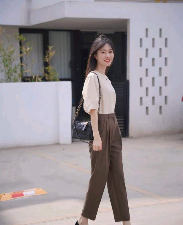 这位时尚博主选择了圆领设计的杏色衬衫搭配驼色西装裤,穿出来的视觉效果虽然简简单单,却让人眼前一亮。