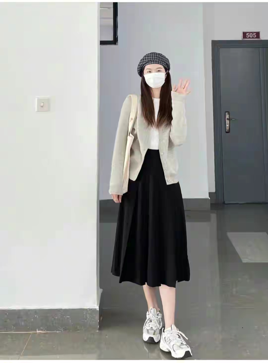 5.浅灰色针织开衫+内搭白色圆领T恤+黑色高腰百褶半身裙+运动鞋