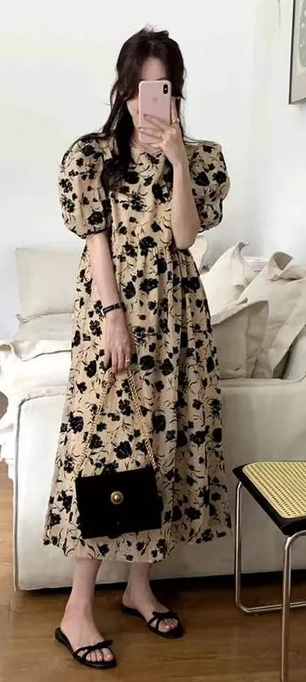 这一款法式复古风格的泡泡袖连衣裙,有点茶歇裙的感觉了!大面积散落的植绒碎花图案,结合米色系面料底色,给人温柔而知性的感觉。