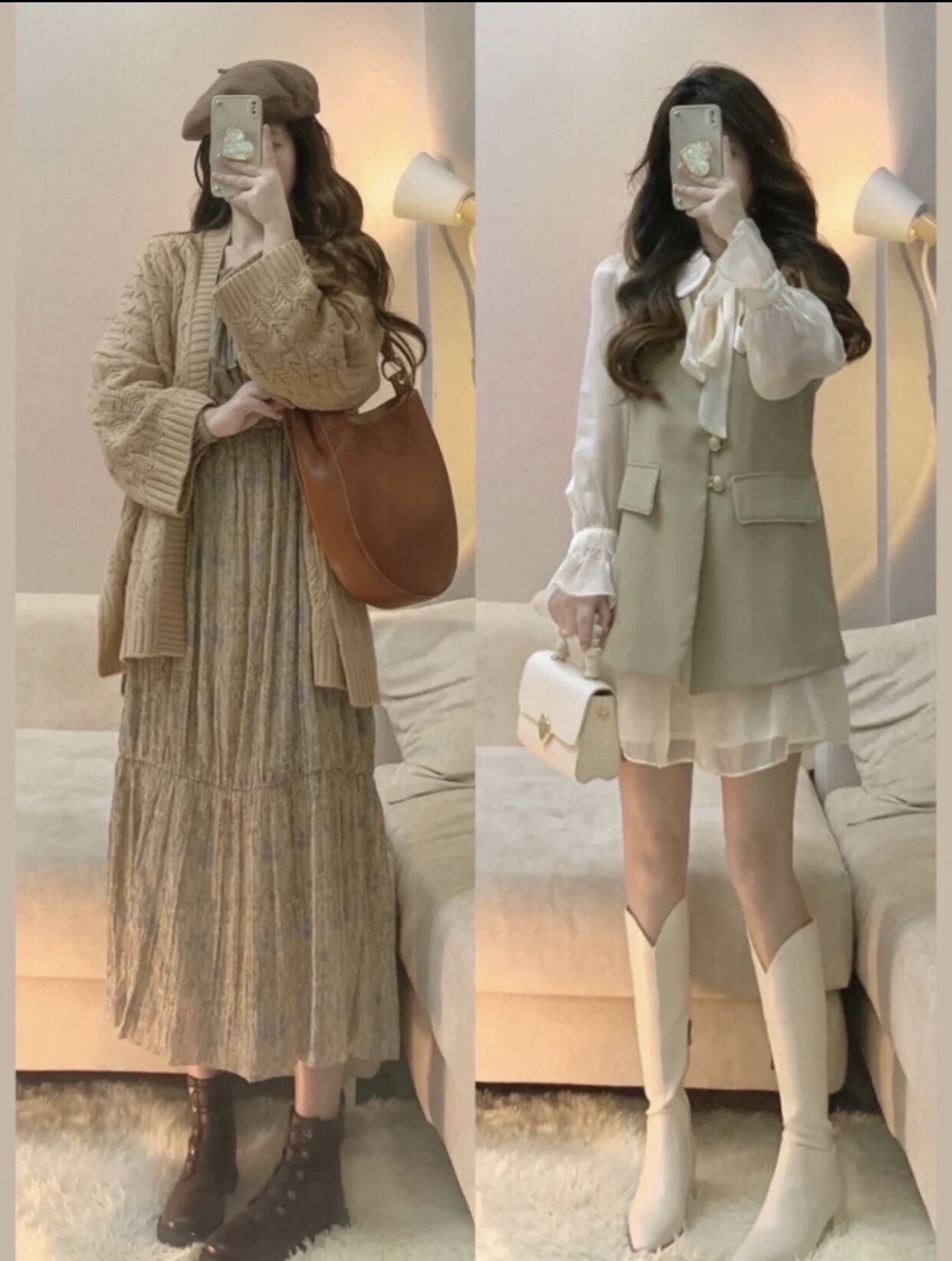 卡基色系的连衣裙搭配粗麻花针织开衫,展现优雅的同时又不失性感,这几套当下流行的单品你学会了吗?