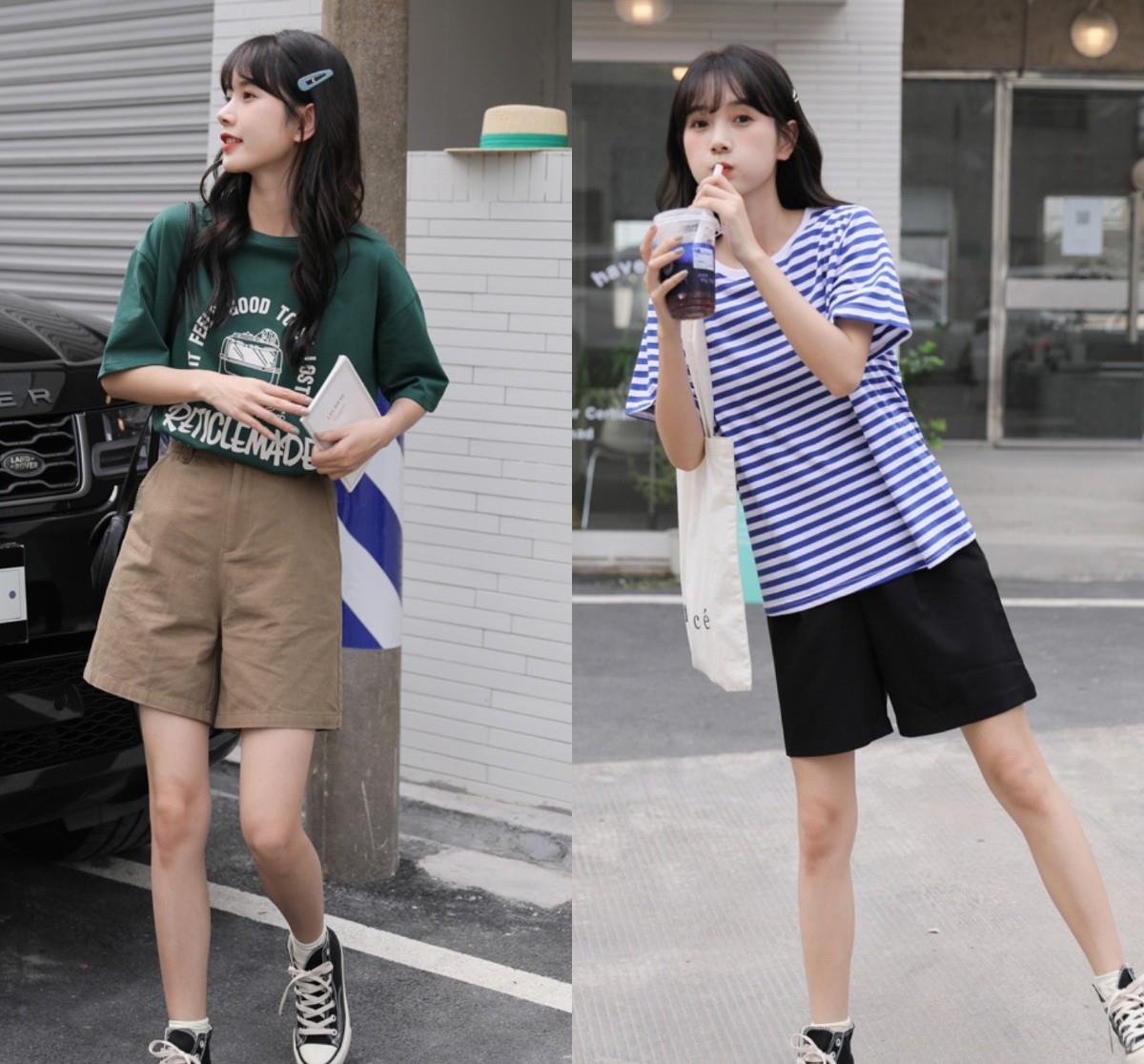 一件蓝白条纹T恤,充满了夏日学院氛围感,再搭配上宽松版型的黑色短裤,简约耐看,秒变日系女孩。