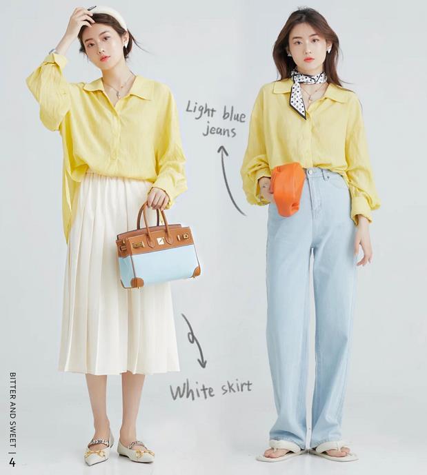 左:衣服再多不会搭配也是白搭,如果你厌倦了白色衬衫,那么不妨试试这种彩色系的款,饱和度不算太高的黄色长袖衬衫,穿起来真的挺衬肤色的,还十分显白!宽松的版型,上身后还自带一种随性休闲范,选择白色百褶半身裙来配,优雅又不失气质感 。