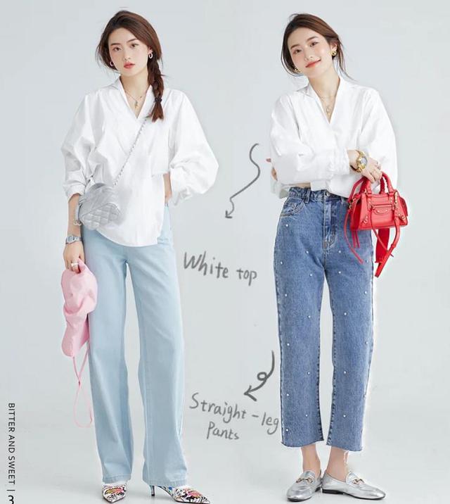 右:与左边穿搭不同的是,右边下身配的牛仔裤,在颜色上有偏差,稍微深一些的牛仔蓝直筒裤,更能衬托出属于白色衬衫的干净。手里拿着的红色包包,倒成为了整个穿搭的亮点。