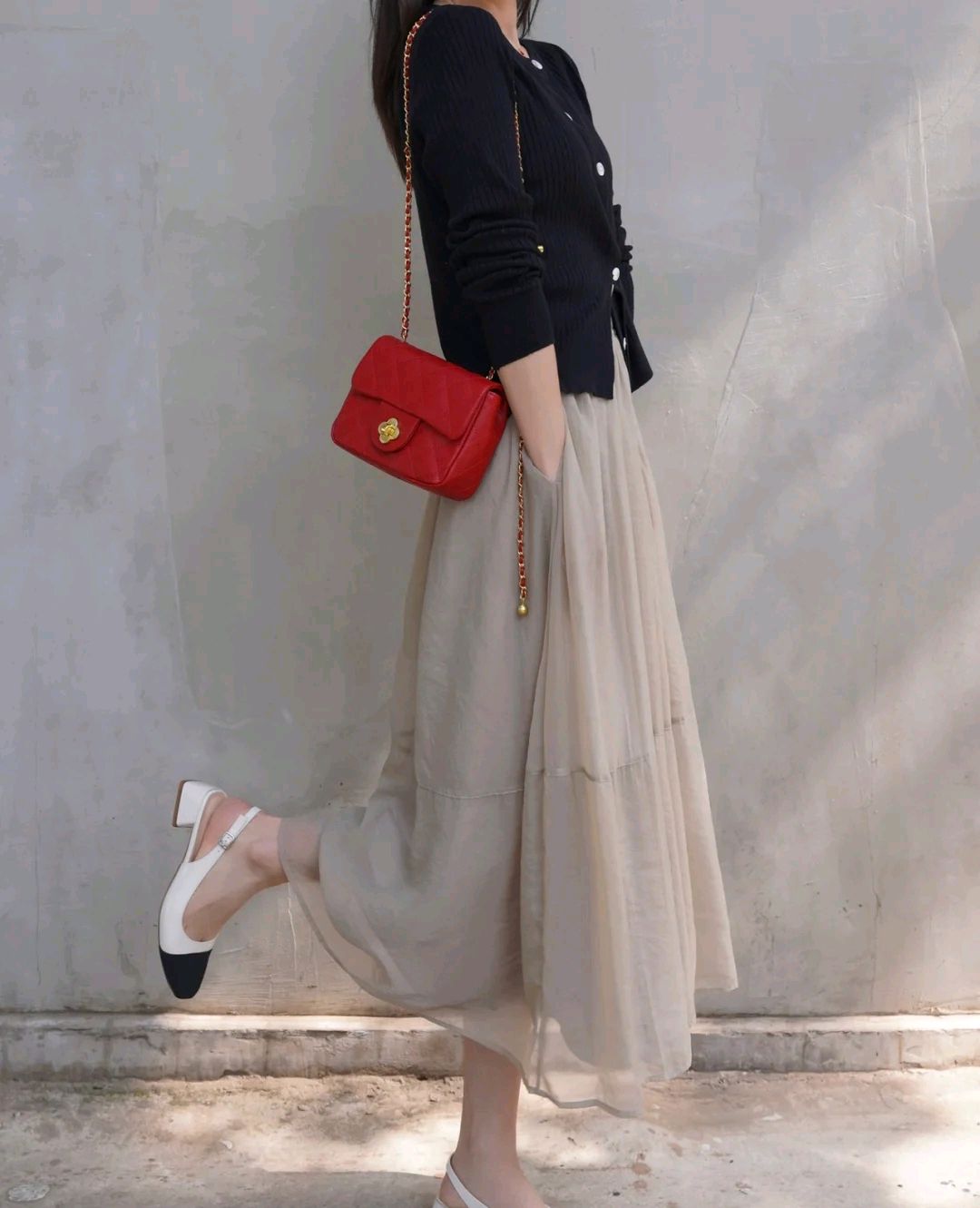 再说了,这身穿搭在服装配色方面也很出色,上衣是黑色,裙子是颜色偏浅的灰色,一深一浅的搭配方法不仅显瘦,还可以避免沉闷感。