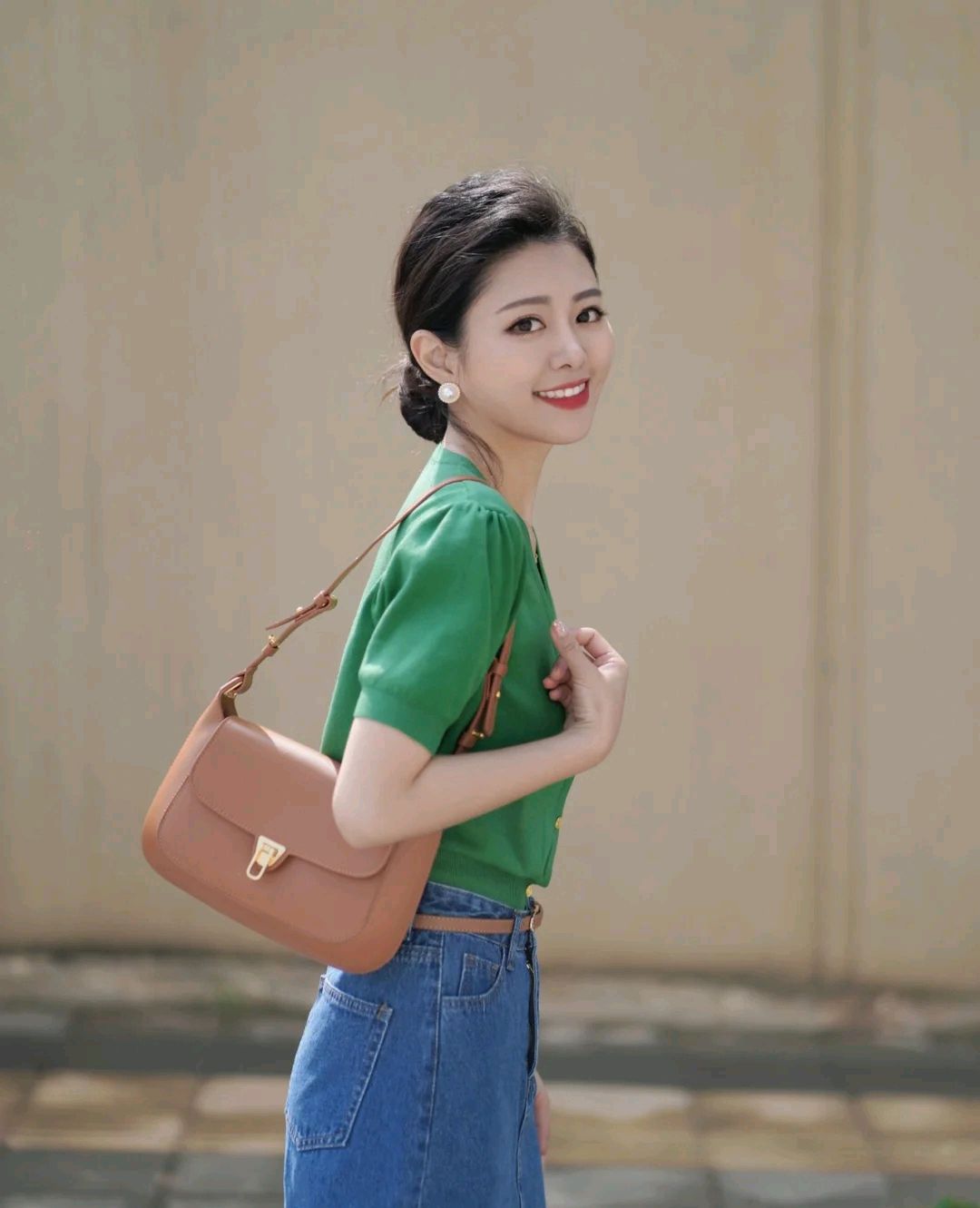这位时尚博主选择了简简单单的绿色针织开衫搭配蓝色牛仔半身裙,穿出来的视觉效果很抢镜却很清新,会显得整个人很有活力。
