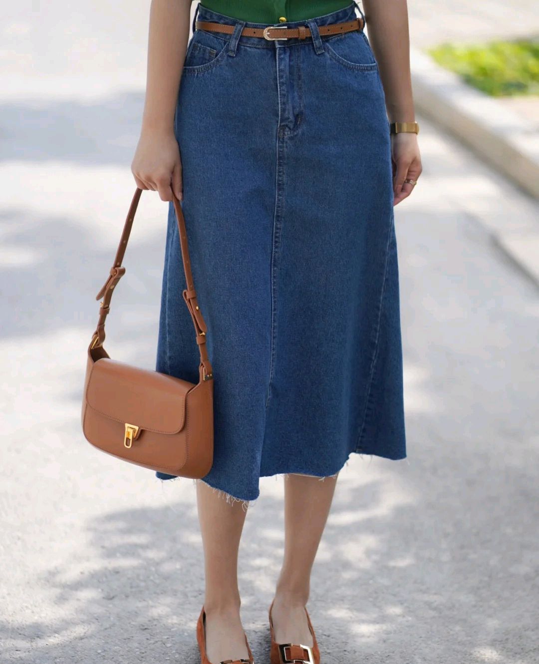 这类似的穿搭可以说很大胆,因为这件上衣是以绿色为主调,如果在服装配色方面没有穿对的话,很容易造型翻车,但这位时尚博主却很大胆地选择了蓝色牛仔半身裙来搭配,别有一番风味。