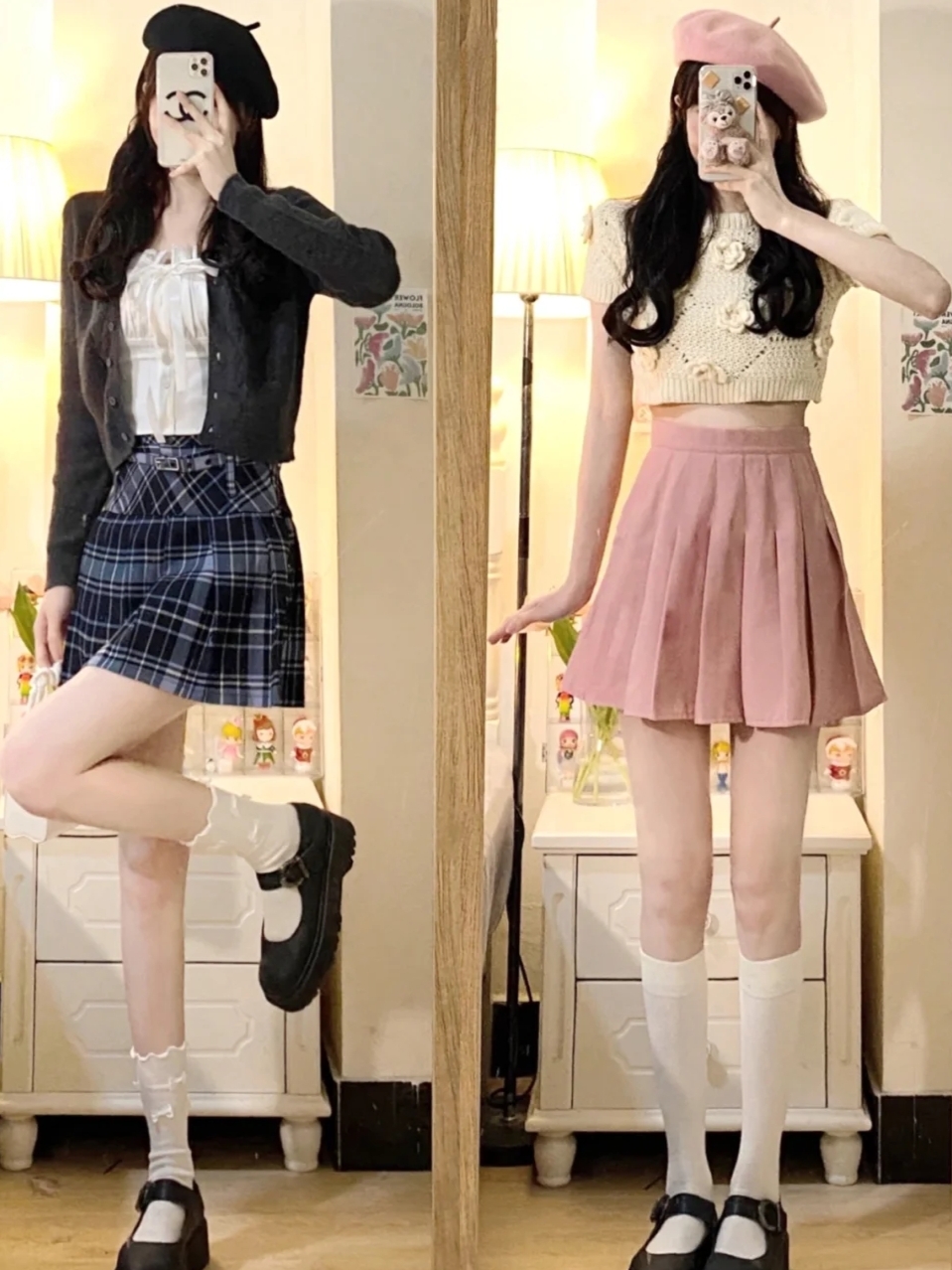 这两套就比较学院风,百褶裙搭配贝雷帽真的会有不一样的美哦,黑色的这套给人一种酷酷女孩的感觉,粉色这套裙子就很少女心啦