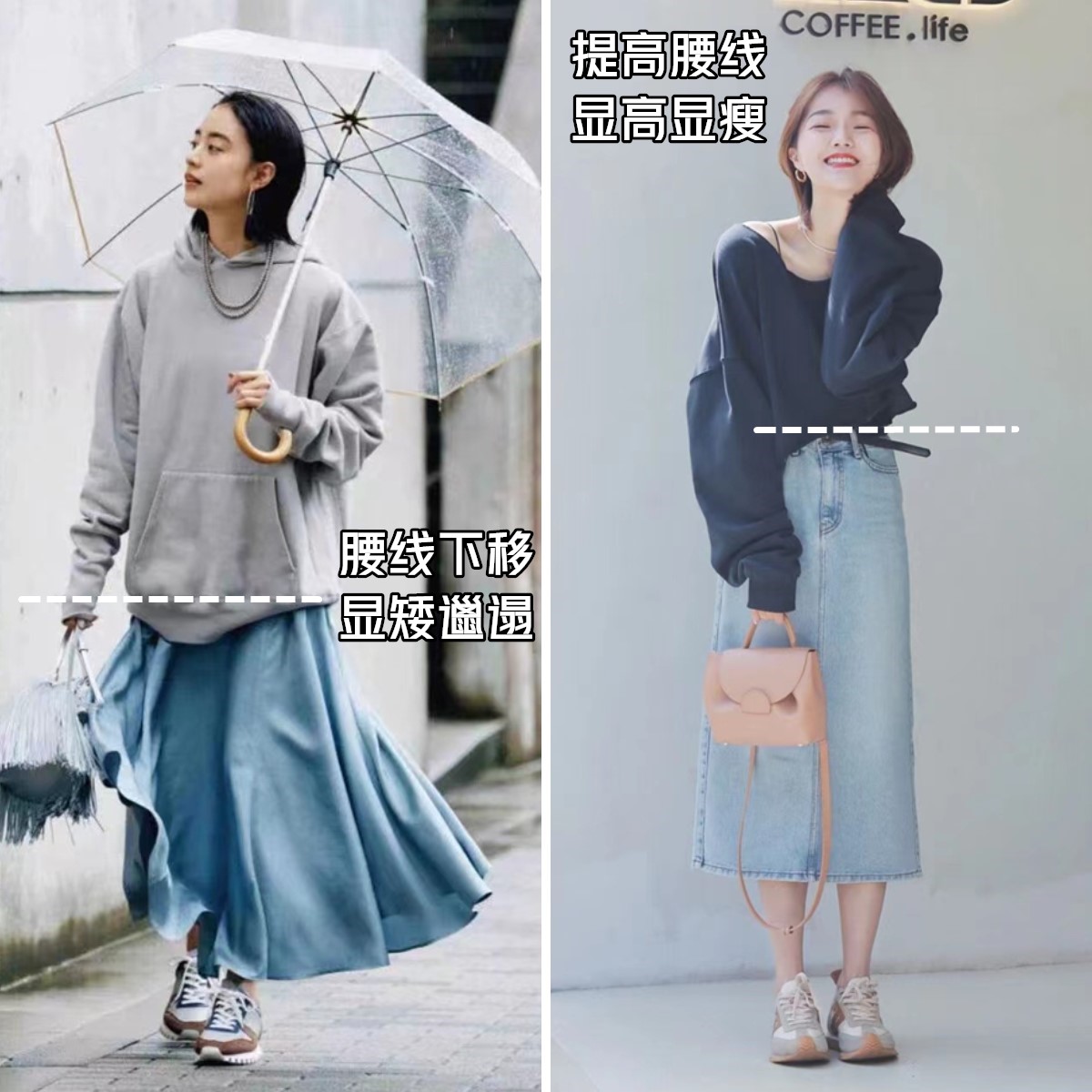 对于宽松的卫衣+连衣裙来说,腰线如果还下移,那真的是1米8也能穿出1米4来,没有了博主们的滤镜和氛围感,现实生活这么穿还非常的邋遢、显胖。