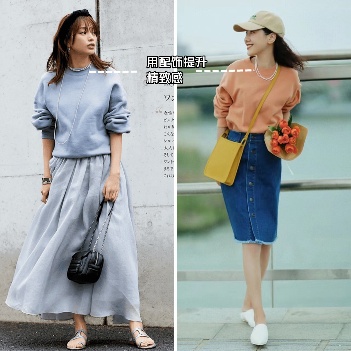 卫衣不管是款式还是面料都算不上什么有品质感的单品,对于对品质感有要求的熟女们,可以利用配饰来增加它的精致度,提高高级感。