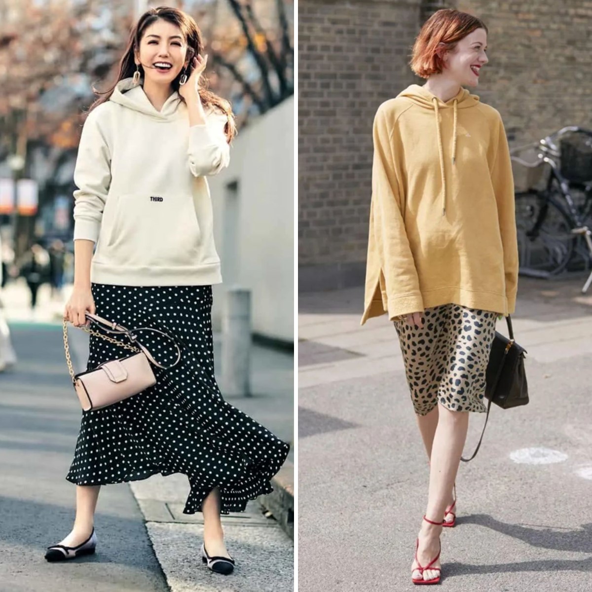 look2:纯色卫衣+印花裙,浪漫又优雅