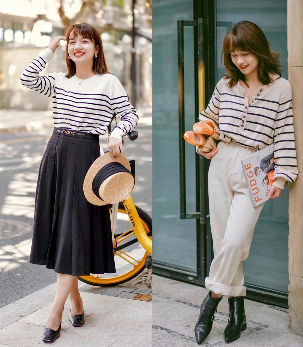 要想穿出具有法式风格的穿搭,那就可以借鉴下图中的这种条纹上衣与纯色下装的搭配。用条纹元素增添复古与浪漫的气息,会让你的造型看起来更加有气质。