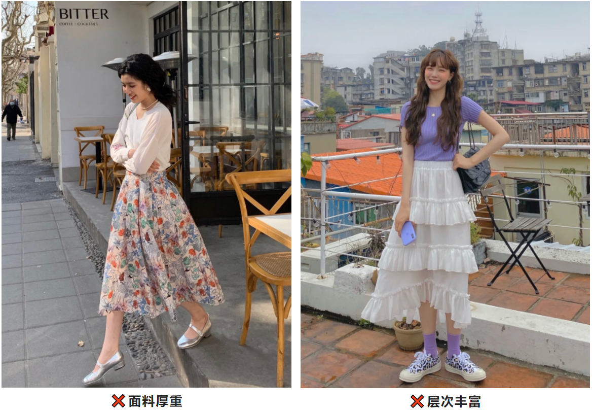 小个子最忌讳是重心太低,特别是这类面料厚重、层次丰富的裙子,容易造成头轻脚重的既视感,压身高显矮。