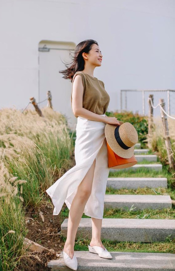 不管是A字裙还是伞裙,都很适合梨型身材的女生,怎么穿都不会出错,也可以小心机的选择开叉的半裙,进一步延伸腿部线条,性感又显腿长。
