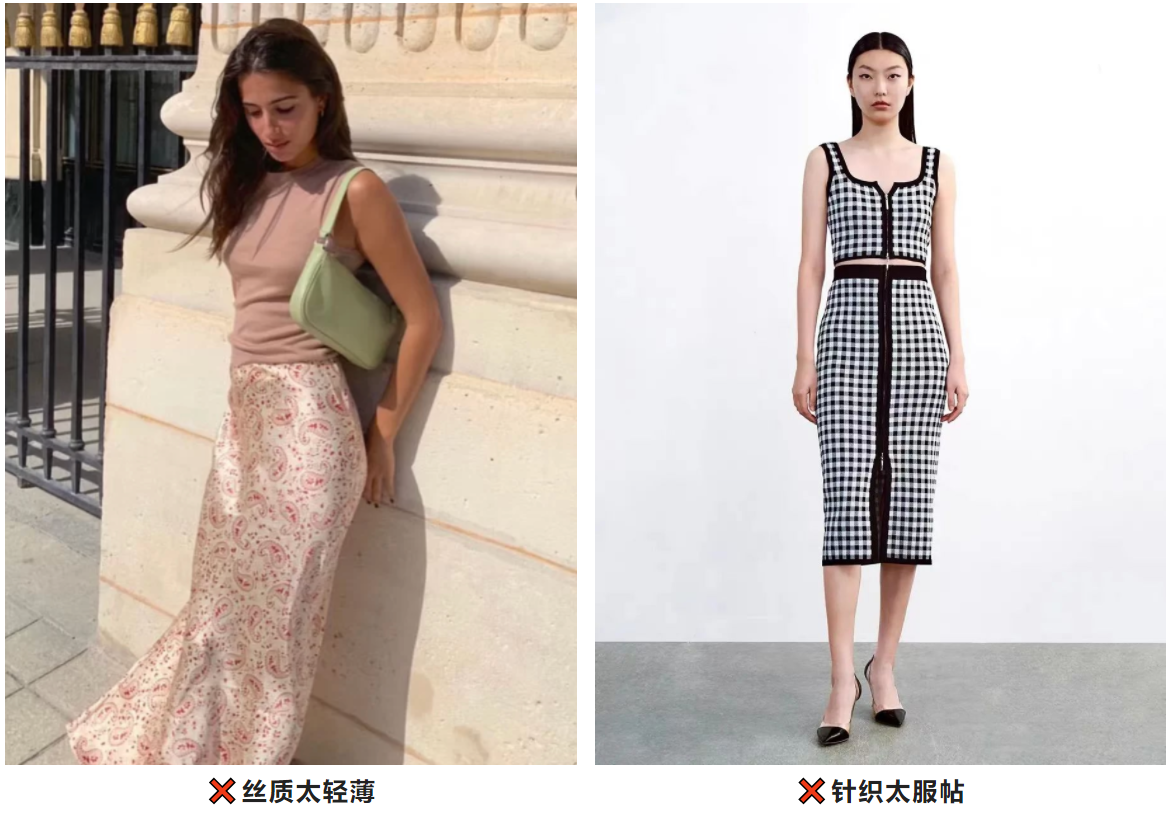 为了能完美的掩盖住胯部的大腿,裙子的面料也需要格外注意,如果像针织、丝质这类面料太轻薄服帖,就很容易暴露身材缺点。