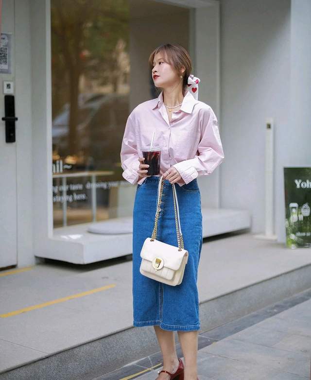 可以借鉴一下这位时尚博主的穿搭风格,她选择了颜色比较浅的粉色衬衫搭配蓝色牛仔半身裙,穿出来的视觉效果很显嫩,但又不会觉得稚嫩,别有一番风味。